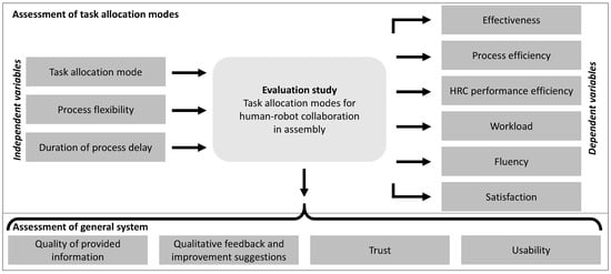 Future manufacturing environments are characterized by workplaces in which human workers and robots work closely together [1]. The industrial assembly has a key impact on productivity and profitability of companies [2] and is to date still largely operated fully manually [3,4]. In view of increasing flexibility requirements due to individualized products, dynamically changing market demands, and shorter product life cycles [5], appropriate solutions to ensure companies’ efficiency and profitability must be implemented [6]. When effectively combining the strengths of humans and robots, productivity for small to medium batch sizes can be improved compared to purely manual assembly [7], while maintaining a higher degree of flexibility compared to fully automated systems [8]. Consequently, industrial assembly represents one of the main fields for the transformation towards hybrid workplaces in human–robot collaboration (HRC) [9,10].