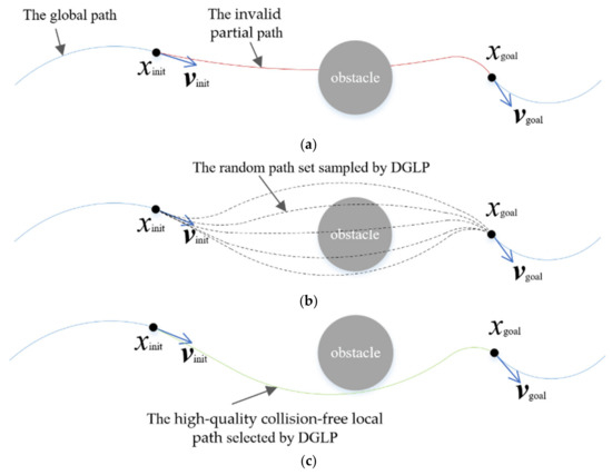 The DGLP plans the local path. The and are the initial node and the goal node of the local re-planning. The and are the velocities at the and . Dashed curves represent a set of random paths. (a) A part of the global path is invalid because of the dynamic obstacle. (b) The DGLP samples random paths that satisfy the path end orientation constraints. (c) The DGLP selects the high-quality collision-free local path from the random path set.