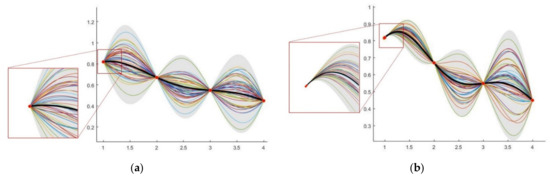 The local paths sampled from the GRPS method, where the red points are waypoints, color curves represent random paths, and the shadow is the sampling range of 99.74% random paths. (a) The local paths without end orientation constraint. (b) The local paths based on the EPOC method.