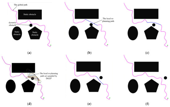 The DGLP re-plans the local paths online in a dynamic environment. (a) The dynamic obstacle is moving from left to right in the environment. (b) The dynamic obstacle invalidates a part of the global path and the DGLP provides a local re-planning path online. (c) As the movement of the obstacle, the previous local path collides with the obstacle, and a new feasible local path is quickly generated by the DGLP. (d) The DGLP samples 100 alternate local paths to select a high-quality collision-free local path. (e) The local re-planning path from the DGPL is smooth and its ends all satisfy orientation constraints to merge into the global path smoothly. (f) The dynamic obstacle no longer collides with the global path, and thus the global path returns to the original state.