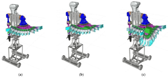 Table 2 shows the results of the robot simulations and experiments, where Avg. time is the average time of local re-planning and Avg. path cost is the average path length of the manipulator end effector. In terms of local re-planning efficiency, the DGLP is more outstanding than RRT and FMT*. The average local planning time of the DGLP in the simulation is 0.03 s, which is 97.12% and 93.02% faster than RRT and FMT*, respectively. In the experiment, the average time of the DGLP is 95.56% and 92.31% faster than RRT and FMT*, respectively. By directly sampling local re-planning paths with sparse nodes via the GRPS method, instead of building large-scale random trees, such as RRT and FMT*, the DGLP can rapidly provide feasible local paths, in addition, the lazy collision detection technique further improves the efficiency of local path re-planning. For local re-planning quality, both in the simulation and experiment, the average path costs of FMT* are minimal since FMT* is an asymptotically optimal method that is good at finding high-quality paths, even the optimal paths. The average path costs of the DGLP in the simulation and experiment are 6.89% and 4.85% higher than FMT*, which means that the DGLP has the ability to plan high-quality local paths. The DGLP based on the random sampling paths is able to conveniently sort sampling path candidates by path cost, so as to quickly select the feasible local path with the highest quality from the candidates. Compared with AO methods based on random trees, such as FMT*, although the DGLP cannot give the optimal path, it can output high-quality collision-free paths more quickly, which is especially important in dynamic environments, since there is not enough time and computational resources to plan the optimal path. Regarding the success rate of local re-planning, the DGLP performs very well. Its overall success rate in the simulation and experiment is 90%.