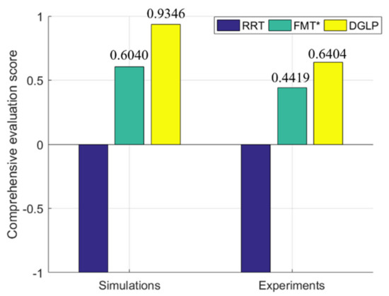where is the comprehensive evaluation score, the and are the normalized values of the planning success rate, computing time, and path cost, respectively, and , , and are the weighting factors. We set due to the computing efficiency priority principle, and set . According to Table 2 and Equation (5), we calculate the comprehensive evaluation scores of the methods, as shown in Figure 8. In all groups of comprehensive evaluation scores, the DGLP scores the highest and its scores are at least 44.92% higher than RRT and FMT*, which demonstrates that the DGLP can well balance the efficiency and quality of the local path re-planning.