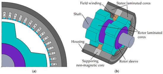 An alternative could be high-reliable and brushless synchronous homopolar machines (SHM) having both excitation and power winding on stator, and a salient-pole rotor. The main advantages of SHMs compared to DCESMs are highly reliable brushless rotor design and concentrated excitation winding, the number of coils of which is small and does not depend on the number of motor poles, while in a DCESM the number of coils (and, therefore, the length of the wire and losses) increase with the number of poles. Such SHMs are widely used as the high-reliable generators in passenger railway cars, on-board generators for ships and aircraft [15,16], automotive generators [17], and in welding units [18].
