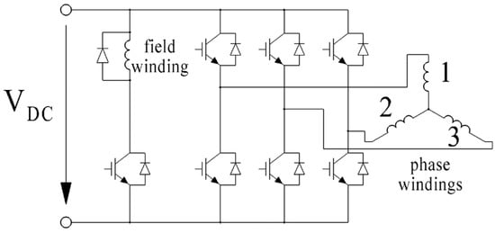 Figure 2 shows the inverter circuit diagram for powering the considered traction motor. To control the three-phase winding, field-oriented control is used, in which the stator current vector is formed in a coordinate system rotating synchronously with the rotor. The excitation winding current is set using PWM proportional to the armature current. The offset angle of the armature current vector from the direction of the greatest magnetic conductivity of the rotor pole for various operating points and the ratio between the armature current and the excitation current are reported in Section 6.