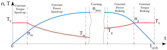 The demanded speed-torque curve of the traction motor is depicted in Figure 4. The right part of the plot corresponds to the driving mode of operation, whereas the left part of the plot represents generating mode. For the sake of simplicity, the negative torque in the generator mode is shown in absolute values above zero. The motor must produce maximum torque T0 = 1240 N∙m and the maximum speed nmax = 4280 rpm.