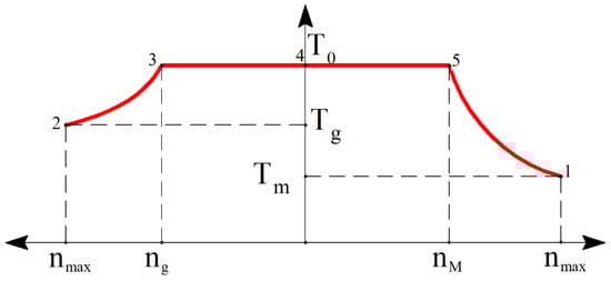 Let’s estimate the value of integral in the numerator of (3) with a help of quadrature formulas. The operation mode of the motor changes in operation points 1–5 (see Figure 4), and there is no derivative of the torque with respect to speed. Therefore, it is reasonable to use the equation of first algebraic order (i.e., trapezoidal rule). Summing up the products of arithmetic means of the integrands A/T and the speed differences at the separate segments from Figure 4 (the segments from the point 2 to point 3, from 3 to 4, from 4 to 5, and from 5 to 1) results in the following: