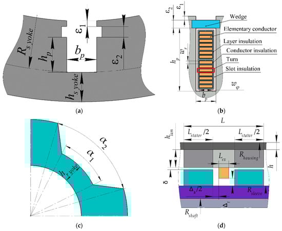SHM geometric parameters. (a) Stator slot; (b) stator winding; (c) rotor core; (d) other dimensions.
