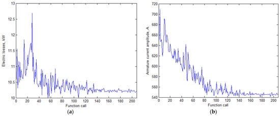 Change of the motor parameters during optimization. (a) Average losses; (b) maximum magnitude of the power winding current.