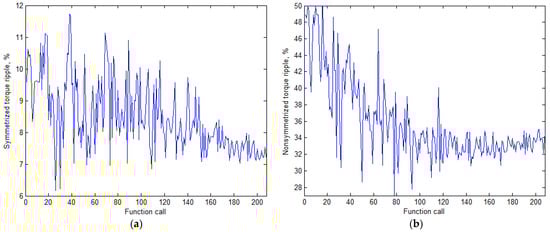 Figure 6 shows the change of the electrical losses and current magnitude during optimization stage. Figure 7 depicts the simultaneous change of the symmetrized and non-symmetrized torque ripple. Figure 8 illustrates the change of the cost function value along the optimization.