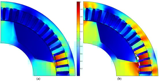 The cross-section of the optimized design of the synchronous homopolar motor and the magnitude plot of flux density (T); white areas mark the extreme saturation level (>2 T). (a) Operating point 1; (b) operating point 4.