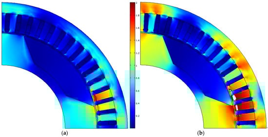 The cross-section of the initial design of the synchronous homopolar motor and the magnitude plot of flux density (T); white areas mark the extreme saturation level (>2 T). (a) Operating point 1; (b) operating point 4.