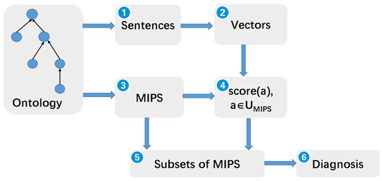 To rank axioms in conflicts based on embeddings, we propose a general approach to computing a diagnosis (see Figure 1). The proposed approach comprises six parts, the first three parts (labeled 1, 2 and 3) can be regarded as offline information preparation, and the other parts (labeled 4, 5 and 6) compute similarities between the axioms to generate a diagnosis automatically.