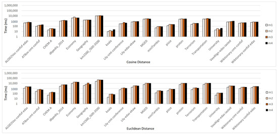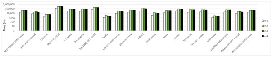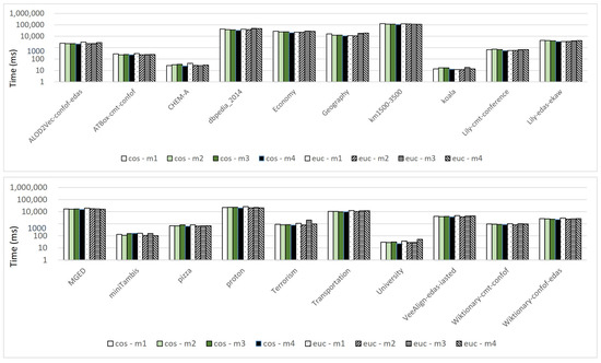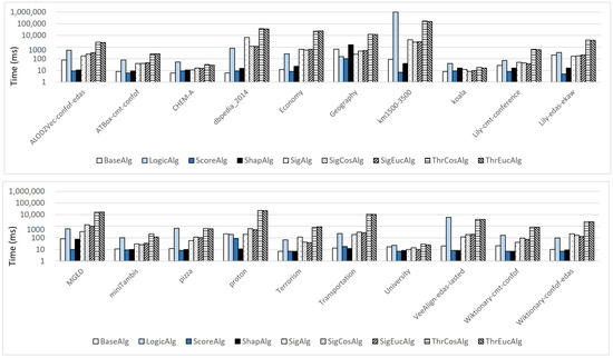 Table 2 presents the details about the chosen incoherent ontologies. The ontology names that consist of three parts and are connected with two symbols of “-” indicate those ontologies constructed by merging two source ontologies and an alignment between them. Here, an alignment consists of a set of correspondences, and correspondence can be translated into an OWL axiom (see [39] for more details). Take ontology as an example. Its name consists of , and . [40] is an ontology matching system, and indicate two source ontologies. This merged ontology is obtained by merging , , and the alignment generated by the system . Similarly, the other 6 merged ontologies use the ontology matching systems [41], Lily [42], VeeAlign [43] and Wiktionary [44]. Those source ontologies come from the conference track provided by Ontology Alignment Evaluation Initiative (http://oaei.ontologymatching.org/2020/ accessed on 15 November 2022), which is a very popular platform to evaluate various ontology matching systems.