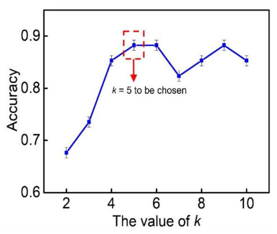 Figure 2 shows the prediction probability corresponding to different k values. We found that when the k value was 5, the maximum prediction probability was 88.2353%; therefore, we chose the k value as 5.