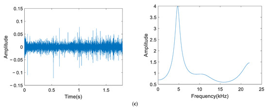 Three typical acoustic signals were selected from the test data set for a comparative analysis. ‘Signal a’ and ‘Signal b’ were signals when the upper layer was seriously flooded, and ‘Signal c’ was the test signal when the column was in normal operation at the same position. The time–frequency domain characteristics comparison diagram of three test signals is shown in Figure 5. Figure 5a is composed of three subgraphs showing the waveform, linear prediction and spectrum of the ‘Signal a’ original acoustic signal from left to right; Figure 5b shows the waveform, linear prediction and spectrum diagram of the ‘Signal b’ original acoustic signal; and Figure 5c shows the waveform, linear prediction and spectrum of the ‘Signal c’ original acoustic signal. The time domain characteristic parameter used in the experiment was the sectional energy ratio, and the frequency domain characteristic parameter was the sixth-order LPC. The characteristic parameters of the three test signals are shown in Table 4. The actual experimental result shows that ‘Signal b’ was judged as flooding, which is correct; however, ‘Signal a’ was incorrectly judged to be in a normal operation state.