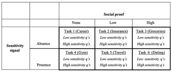 Figure 2 depicts the experimental design, including the tasks, the nudges combination each task represents, their randomly assigned context, and the questions’ sensitivity levels.