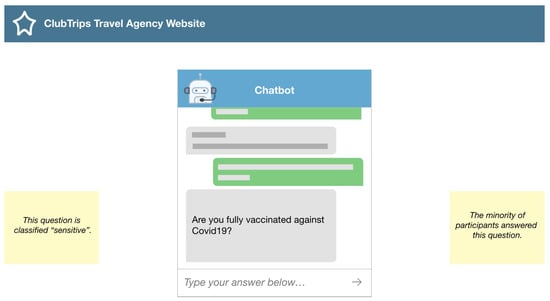 To generate a pool of low and high-sensitivity questions to be used in the lab experiment and control for the relevance of each question to their assigned context, a within-subject online questionnaire was administered on Qualtrics (Provo, UT, USA) and distributed through Amazon Mechanical Turk (Mturk). To build the questionnaire, a pool of 210 questions centered around six contexts (35 questions per context) was generated based on prior research investigating sensitive topics [49,113] (e.g., in the travel context: “Are you fully vaccinated against Covid19? Refer to Appendix A for the full list of questions”).