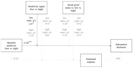 Second, emotional response could also explain how the information disclosure nudges evoke a reaction in users. Peripheral cues are said to serve an important role in consumer behaviors [112]. The sensitivity signal and social proof nudges used in this study are presented to give users cues on the level of sensitivity of each question and whether other users answer them. They could predict the activation of the nervous system of users as they represent a clear cause, with cognitive content, that could trigger an emotional response from users. For the sensitivity signal nudge, since it informs users on the categorization of the question asked, the resulting activation would be proportional to the level of sensitivity of the question. For the social proof nudge, the reaction would depend on the behavior of others, independently of the question sensitivity. Specifically, knowing that a minority of people answered a question would be perceived as a higher risk and the opposite would be observed for when a majority of people answered a question, regardless of the question’s sensitivity. To assess the extent to which the presence of information disclosure nudges evokes emotional response (measured with arousal) among users, we posit that the relationship between question sensitivity signal and emotional response is moderated by sensitivity signal such that: