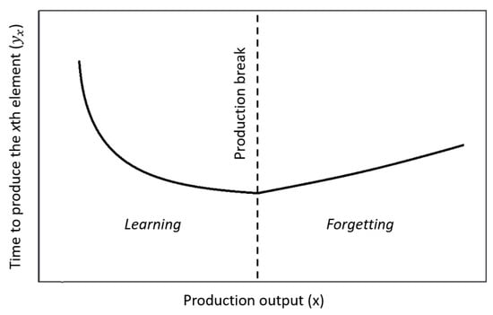 Many models of forgetting have also been developed. Although the phenomenon is the opposite of learning, it is usually not modelled as simply the mirror image of learning (Figure 1). Some of the most renown forgetting models include: the variable regression variable forgetting model (VRVF) [53], the variable regression invariant forgetting model (VRIF) [54], the learn–forget curve model (LFCM) [55], the power integration diffusion model (PID) [56], and the depletion power integration latency model (DPIL) [57].