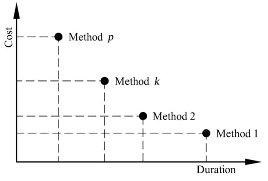 Each of the m works in n units performed by a given working group can be executed in several ways (the fact results from the possibility of adopting various technologies for carrying out the works). It is assumed that the more expensive method (mode) enables faster performance of a given activity, and the cheaper method allows only a slower performance of a given activity (the same assumption was made by [63]). For example, the use of more efficient, but more expensive resources (e.g., machines) allows for speeding up the performance of works. By using cheaper but less efficient resources, the duration is extended. The relationship between the cost of performing an activity and its duration for various modes of a single activity is presented in Figure 2. In the model of the project under consideration, the mode is selected for each activity. Each mode is characterized by a specific the duration of the activity and its cost. The selected modes for the whole project are presented in the form of a vector–array (with each element representing mode selected for a given activity).