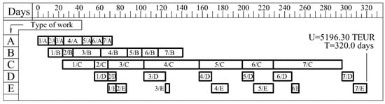 The calculated total cost for this project is EUR 4622.84 thousand, and the duration is 295 working days. The cost of the project implementation is lower by 7.0% compared to the cost of the project implementation according to the initial schedule. The duration of the suboptimal schedule is 3.7% shorter than that of the baseline schedule. The obtained suboptimal schedule is presented in Figure 5.
