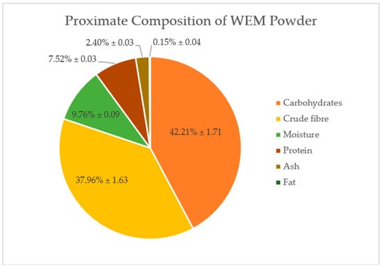 This study aims to utilise edible mushrooms as a functional ingredient for food products, as there are reported studies on the underutilisation of this ingredient [,]. Edible mushrooms are considered a superfood that is highly nutritious, low in calories and possesses other biological compounds beneficial to human health [,]. The proximate composition of WEM powder is shown in Figure 1, where the highest composition is a carbohydrate, followed by crude fibre, moisture, protein, ash, and fat. The fat content of WEM powder was the lowest as all edible mushrooms are well-known for the low fat content (≤5% dry weight) and were the least nutritive constituents [].