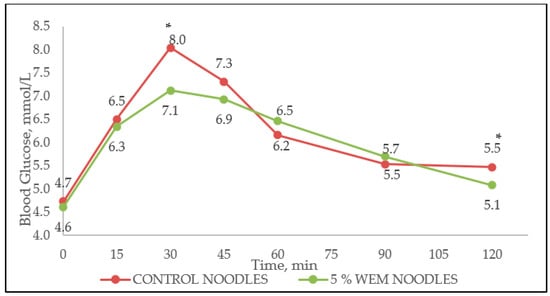The comparison of postprandial blood glucose response within 120 min between control and 5% WEM instant noodles (n = 10), * indicates a significant difference (p < 0.05).