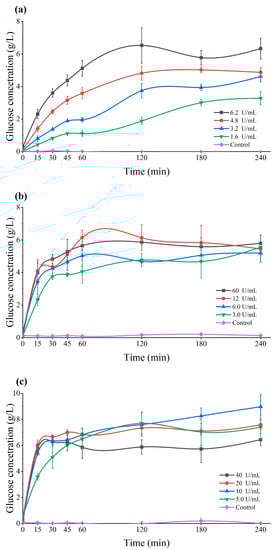 Due to the possible influence of medium components and parameters, such as pH or salinity, on enzyme activity and stability, the efficiency of substrate hydrolysis in time was analysed. The glucose liberation profile to media differed depending on the initial amount of used enzyme units. In the culture medium with sucrose and β-D-Fru, 6.0, 5.0, and 3.0 g/L of glucose were obtained after 4 h (Figure 2a). In the medium with lactose and β-galactosidase expected, 5.0 g/L of glucose was detected within 3 h for all variants of the enzyme units (Figure 2b). In the medium with starch and glucoamylase, glucose concentration was assumed within less than 4 h, with the highest speed in a medium containing 10 U/mL of the enzyme (Figure 2c). The profile of glucose liberation in media with sucrose and β-D-fructofuranosidase suggested the possibility of regulating the dynamics of increasing the accessibility of carbon sources. However, the ability of enzymes to act for an extended time depends on their stability in the reaction environment. The level of remaining activity, measured after finishing cultivation time, indicated that β-D-fructofuranosidase and glucoamylase retained similar initial activity levels, in contrast to β-galactosidase, which showed significantly lower operational stability (Table 1). The decreasing stability can be explained by the progressive decrease of medium pH that can negatively influence the enzyme’s molecular structure. The acidic pH is especially not favourable for maintaining proper enzyme conformation and activity for a long time [34,35]. The profile of glucose liberation, particularly in media with sucrose and β-D-Fru, suggests the possibility of regulating the gradual increase of the accessibility of carbon sources by the amounts of used enzymes. It could potentially reduce the rate of media acidification and retain significant enzyme activity for a longer time. However, most initial substrates were converted to monosaccharides in the first hour, when the number of bacterial cells was low and media pH was stable.