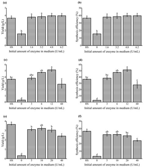 BC synthesis yield and efficiency for samples growing on medium containing sucrose (a,b), lactose (c,d), and starch (e,f), supplemented accordingly with β-D-Fru, β-Gal, and GLA in proper units’ concentration. Bars marked as HS refers to parameters of K. xylinus cultures maintained on standard Hestrin-Schram medium with glucose as the sole carbon source. The means with common superscript are not significantly different from each other (p < 0.05). Error bars represent standard deviation.