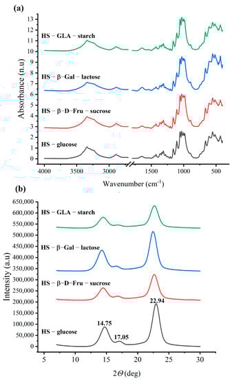 The representative ATR-FTIR spectra (a) and XRD diffractograms (b) of bacterial cellulose obtained from cultures with enzymatic conversion of sucrose, lactose, and starch to accessible carbon sources. The spectra from analysis BC samples obtained from modified media with the highest enzyme units amounts.