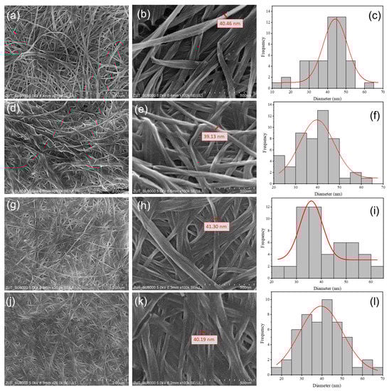 The SEM images of the BC obtained from cultures with different oligo- and polysaccharides as carbon source hydrolysed by specific enzymes at 20,000× (left column), 100,000× (centre column) magnification and distribution of BC microfibrils diameters’ (right column). The BC samples obtained from standard HS medium—(a–c), medium with sucrose and β-D-Fru—(d–f), medium with lactose and β-Gal—(g–i), and from a medium with starch and GLA—(j–l). The presented SEM images show the BC surface obtained from modified cultivation media with the highest enzymes units amounts.