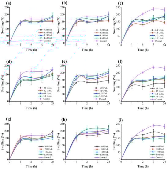 The influence of pH on the swelling ratio of BC obtained from analyses on cultivation media variant. The SR for BC obtained from the medium with sucrose and β-D-Fru at pH 4.0 (a), 5.0 (b) and 7.0 (c), lactose and β-Gal at pH 4.0 (d), 5.0 (e), and 7.0 (f); with starch and GLA at pH 4.0 (g), 5.0 (h), and 7.0 (i).