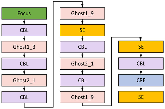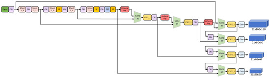 The backbone network structure is shown in Figure 2. The network designed in this paper makes full use of the feature map generated during the sampling process on the backbone network. Based on the original YOLOv5 three-layer detection layer, the feature map with a scale of 64 × 160 × 160 generated by downsampling is combined with the same scale feature map of the head to form a minimum scale detection layer. Among them, the internal structure diagram of each module in the backbone network of Figure 2 is further explained in detail in Figure 3.