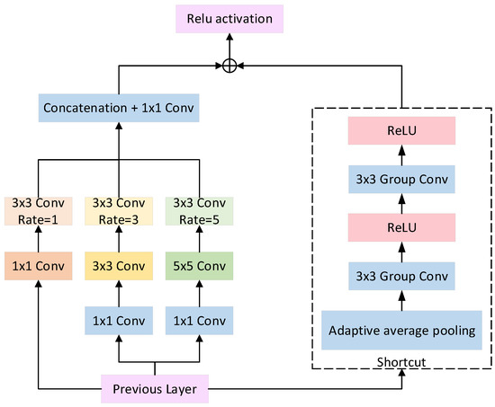 As shown in Figure 4, for the input feature map, the number of feature map channels is reduced by the convolution layer of 1 × 1 to reduce the computational overhead. Then, 1 × 1, 3 × 3, and 5 × 5 convolution kernels of different sizes are used to form a convolution layer of three branches to obtain receptive fields of different sizes, obtain more detailed feature information, and form receptive fields of different scales. Connect the dilated convolution corresponding to the expansion rate, and set the expansion rate as 1, 3, and 5, respectively. The convolution kernel is a 3 × 3 dilated convolution. By setting different expansion rates on different scale receptive fields, the eccentricity of each branch is obtained. Based on ensuring the resolution, the receptive field is increased, the discrimination ability of feature information is improved, and all branches are connected by Concat function.