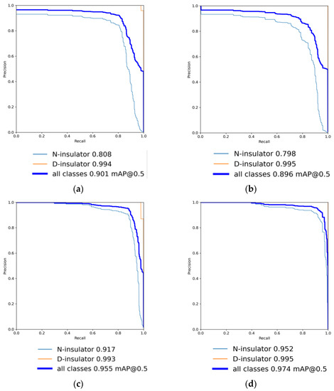 As shown in Figure 6, the light blue curve is the P-R curve of the N-insulator category, the orange curve is the P-R curve of the D-insulator category, and the dark blue curve is the P-R curve of the overall average accuracy of the network. In the P-R graph, the abscissa is the recall rate, and the ordinate is the precision rate. The larger the area enclosed by the curve and the abscissa and ordinate axes, the closer the curve is to the upper right corner, and the better the network performance. The four experimental groups combined with the ablation experiment produced their corresponding P-R curves, arranged in order, as shown in Figure 6. By comparing the four graphs, it can be seen that the area enclosed by the curve and the horizontal and vertical axes in image (d) is larger, the accuracy and recall rate is higher, and the network model performance is better than the first four.