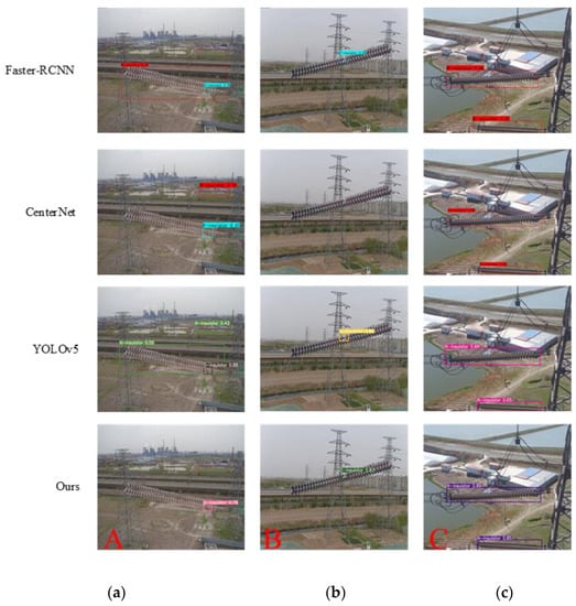 The image in Figure 7 is the detection result map under different network models, where (a), (b) and (c) columns are three different insulator images to be detected. The detection results of the four network models are in turn. Through the picture, it is more clear and more intuitive to see that Faster-RCNN in column (a) misdetects the defective insulator as a normal insulator. The CenterNet network model misdetects the enclosure in the background as a normal insulator and the CenterNet in column (b) does not detect the defective insulator, resulting in a missed detection. The original YOLOv5 model also shows false detection of the wall in the defective insulators in column (a) and false detection of defective insulators. For defective insulators listed in (a), the method presented in this paper has more advantages. For normal insulators listed in (c) for detection, it can be seen that the results of the four models are better for the detection of normal insulators. Combined with network detection indicators and intuitive picture results, it can be seen that this method has higher detection accuracy and faster detection speed. From the detection accuracy and speed, this algorithm has more advantages.