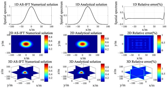 The simplified Gaussian function verifies the 1D, 2D, and 3D methods of the AS-FT. The spatial domain and wavenumber domain expressions of the Gaussian function are shown in Table 1, where a = 0.001. The sampling range of spatial domain x, y, z, and wavenumber domain kx, ky, kz are shown in Table 1. The forward and inverse transform are uniformly sampled, and the number of sampling points is 101.
