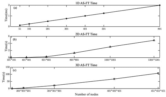 Time required for one transformation of 1D, 2D, and 3D AS-FT. (a) Calculation time of 1D AS-FT under different node numbers. (b) Calculation time of 2D AS-FT under different node numbers. (c) Calculation time of 3D AS-FT under different node numbers.