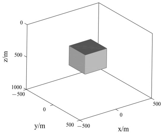 Prism model. The calculation area is 1000 m × 1000 m × 1000 m, with ranges 6f −500–500 m in the x direction, −500–500 m in the y direction, and 0–1000 m in the z direction. The prism anomaly is a cube with a side length of 400 m, and the prism’s center coincides with the model’s center. The magnetic susceptibility of the prism is 0.01 SI.