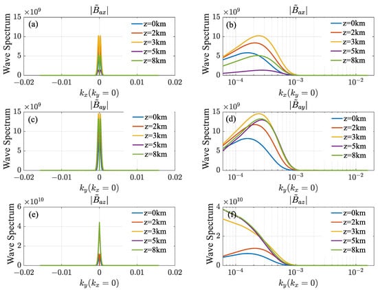 Spectrum distribution of weak magnetic field at different depths. The horizontal ordinate of figures (a,c,e) is non-logarithmic, and the horizontal ordinate of figures (b,d,f) is logarithmic.
