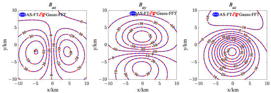Based on the 3D numerical simulation algorithm of a magnetic anomaly in the space-wavenumber domain [], the model was designed and simulated by the standard-FFT, Gauss-FFT [], and AS-FT method proposed in this paper.