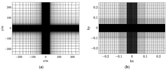 Next, to better fit the abnormal body, non-uniform sampling was selected in the spatial domain. The spatial domain was divided non-uniformly in the horizontal direction, and the sample was densified at the abnormal sphere. The sample interval away from the abnormal sphere was gradually increased, with the minimum grid spacing of 1 m and the maximum grid spacing of 32 m. Its grid is shown in Figure 16a. Piecewise uniform and log-domain sampling were adopted for the wavenumber range of −0.25–0.25. The strategy of piecewise uniform sampling is to divide into three segments according to the spectral energy distribution, with uniform sampling in each part. Taking the positive wavenumber as an example, 31 nodes were taken from 0 to 0.04, 11 nodes were taken from 0.04 to 0.1, and 11 nodes were taken from 0.1 to 0.25. The negative wavenumber was symmetrical with the positive wavenumber, with a total of 101 nodes, as shown in Figure 16b. When piecewise uniform sampling was adopted, after six iterations, the Rrms errors of the numerical solution of the ground field value were 0.19%, 0.24%, and 0.25% compared with the analytical solution of the strong magnetic sphere, respectively. When piecewise uniform sampling was adopted, after six iterations, the Rrms errors of the numerical solution of the ground field value were 0.17%, 0.17%, and 0.21%, respectively. Therefore, high accuracy can be achieved in the cases of non-uniform sampling in the spatial domain, piecewise uniform sampling, and log-domain sampling in the wavenumber domain. This shows that the AS-FT algorithm can realize arbitrary samples and has high computational efficiency and accuracy.