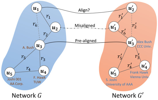 Another line of research for UA utilizes the structural information of social networks. More current methods incorporate both user attributes and network structures to enhance the UA performance [13,14]. For instance, the model REGAL [13] captures the node’s structural identity and attribute identity by a matrix factorization-based approach. Another typically related study on UA feature combination is undertaken in CoLink [15], which iteratively learns an attribute-based and a structure-based model with a co-training strategy. However, (Challenge 2) it is not a trivial task to effectively leverage user attributes and network structures to address UA problems when they are quite imbalanced. The attributes and relationships of users in real social networks can be diverse. Some users offer little profiles on their home pages but have rich connections with others. On the contrary, a number of users on LinkedIn give detailed personal information but they do not like to interact with others. This imbalance results in the low accuracy of user identification algorithms. If either of the two feature types is too faulty, it may lead to error propagation or additional noise. An example is shown in Figure 1. If the actually existing relations r 6 and r 2 are missing, user u 2 can be easily aligned to u 1 by mistake. Similarly, the linkage error might be propagated to the other pair u 1 and u 2 with the help of relations r 1 and r 1 . Moreover, it is also possible for a careless algorithm to determine incorrectly that u 5 and u 5 are not the same natural person by comparing their names “Joshi 001“ and “S. Joshi”, or their affiliations “AA Corp.” and “University of AAA”. Therefore, attributes and relations have different levels of importance in UA tasks when they are considered imbalanced. Distinguishing the contributions of attribute information and structural information benefits a great deal from enhancing the linking accuracy of UA models. This paper adopts an embedding-based approach to incorporate user attributes and network structures into a unified optimization framework, which ensures the robustness of the model.