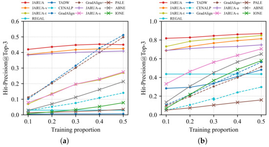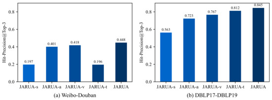 As demonstrated in Figure 4a,b, JARUA constantly outperforms all four variants across all training proportions. Here, we take a 30% training proportion as an example to discuss the contributions of JARUA components. Figure 5 shows the performances of the variants of JARUA. Clearly, JARUA performs better than JARUA-s by 25.1% on WD and 28.2% on DBLP, which can be attributed to incorporating attributes information. JARUA beats JARUA-a by 4.7% on WD and 12.2% on DBLP, suggesting that utilizing network structural information benefits the UA tasks. However, this effect is not so strong as attribute information in our data sets. Thus, JARUA is quite promising when attribute information is sufficient. It is found that JARUA achieves Hit-Precision values 3.0% higher than JARUA-v on WD and 7.8% higher on DBLP. This suggests that the iterative training algorithm significantly improves the model performances. Moreover, JARUA beats JARUA-t by 25.6% on WD and 3.3% on DBLP. This demonstrates that the proposed multi-granularity attribute embedding performs well in modeling multi-type text attributes.
