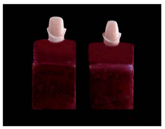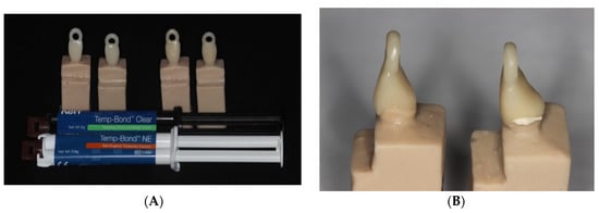 Two different types of provisional cements, Kerr Temp-Bond NE conventional cement (Kerr, Romulus, MI, USA, Lot 8205180) and Kerr Temp-Bond clear cement (Kerr, Romulus, MI, USA, Lot 8224958), were used. Half of the crowns from each subgroup (n = 10) were cemented on the respective model with Temp-Bond NE conventional cement and the other half with Kerr Temp-Bond clear cement. A description of each test group is listed in Table 1. The crowns were cemented on the models until a complete set of temporary cement was obtained. An approximate force of 2.5 kg for 5 min was used for cementation [21]. Excess cement was then removed using an explorer after the initial setting (Figure 4A,B).