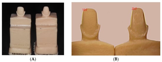 (A) Working models made with 3D-printed resin dies and 10° and 20° tapers. (B) Tapers measured using a computer system consisting of a stereomicroscope with a connected USB CCD camera, a personal computer, and compatible measurement software.