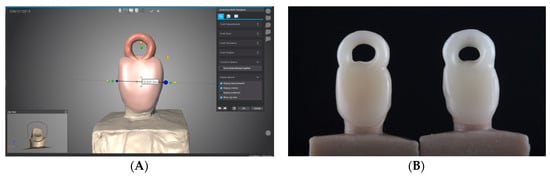 Forty working models were 3D printed with the 10-degree taper and forty models were printed with the 20-degree taper. All of the samples were evaluated for integrity and suitability before being included in the study. The models were scanned individually to develop separate STL files, in which each file was processed individually. After setting the margin with a cement space of 50 μm, as well as designing an incisal ring with a 4 mm external diameter and a 2 mm internal diameter, each STL file was saved and used to produce 40 samples of CAD/CAM-milled temporary crowns (twenty from each taper group) using a five-axis milling machine (DG SHAPE, Roland DGA, Irvine, CA, USA, Model DWX-52D) and PMMA temporary crowns blocks (CopraTemp Shade A1, WhitePeaks Dental Solutions GmbH, Wesel, Germany). Similarly, 40 samples of 3D-printed temporary crowns (twenty from each taper group) were produced using the same printing system on the working models with the corresponding resin material (DentaTooth Shade A1, Asiga, Alexandria, Australia, Lot MO/08782) (Figure 3A,B). All of the temporary crowns were checked for fit on the corresponding working models.