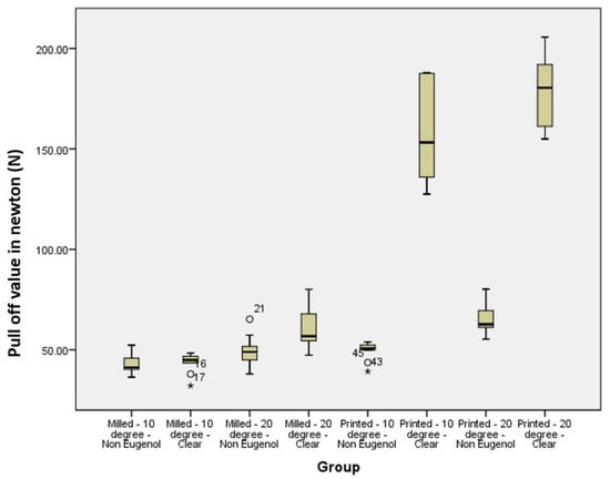 Box plot showing pull-off force values (N) from groups 1-8 performed using the post-hoc Bonferroni test.