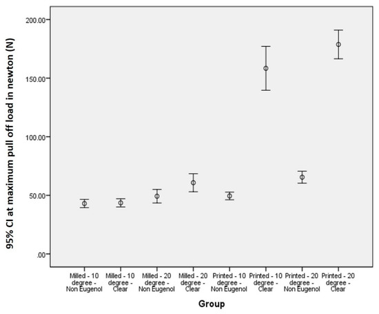 Analysis of variance (one-way ANOVA) was used to test the retentive strength of the different temporary crowns, cements, and crown tapers. Intergroup comparisons between groups 1–8 were performed using the post-hoc Bonferroni test (Figure 7). Additionally, the 95% confidence interval was calculated (Figure 8).