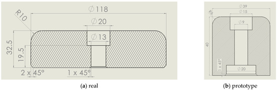 The punch geometry set for the experimental tests consisted of a hollow cylinder with a fillet radius on the face in contact with the blanks. The hollow geometry was designed to enable a mechanical connection by means of a screw between punch and press. To test the capability of the process, two geometries were used: a first, termed real geometry (RG), with an external diameter of 118 mm, similar to that found in real-world manufacturing applications; and a second, termed prototype geometry (PG), with an external diameter of 39 mm. Both geometries are depicted in Figure 1.